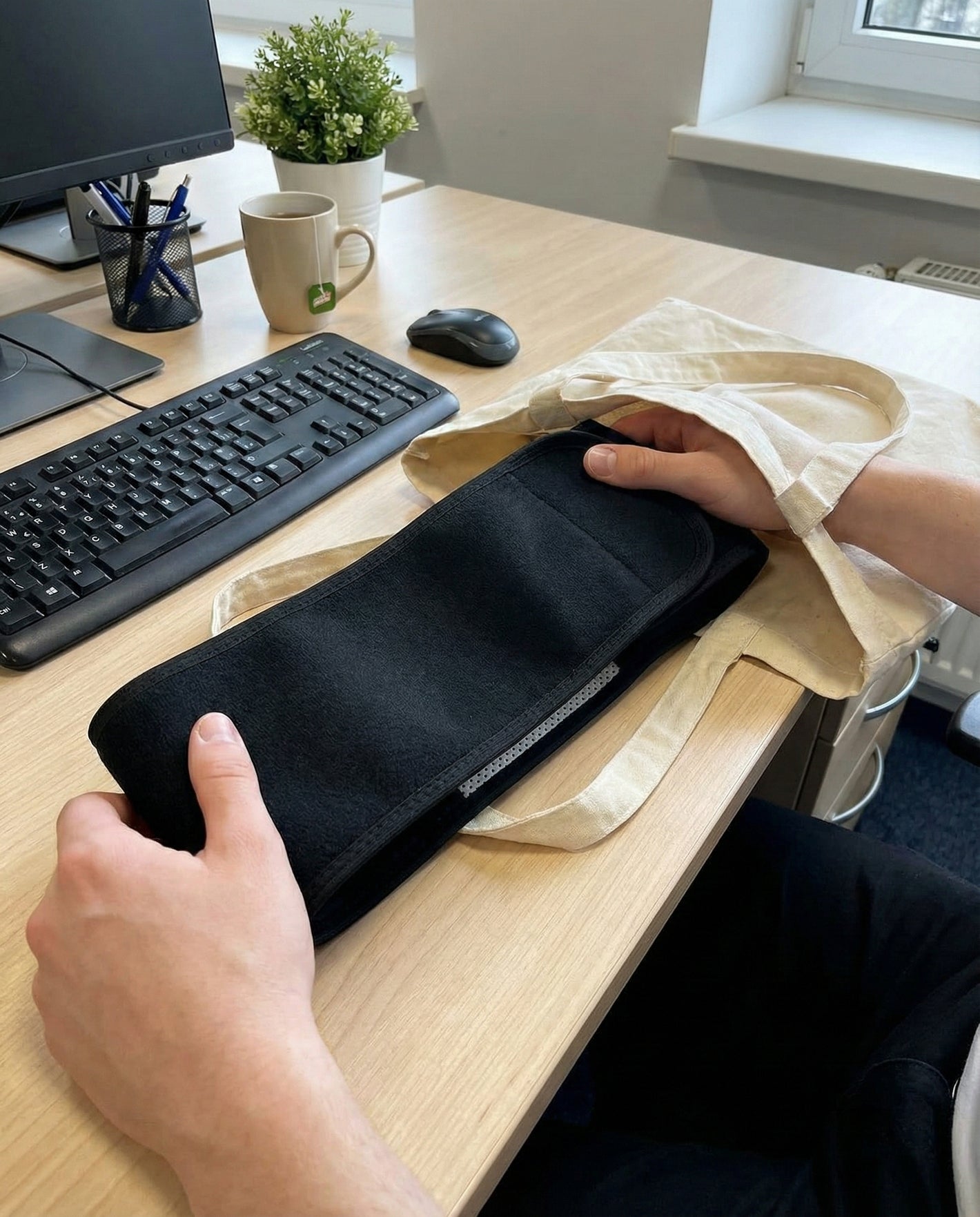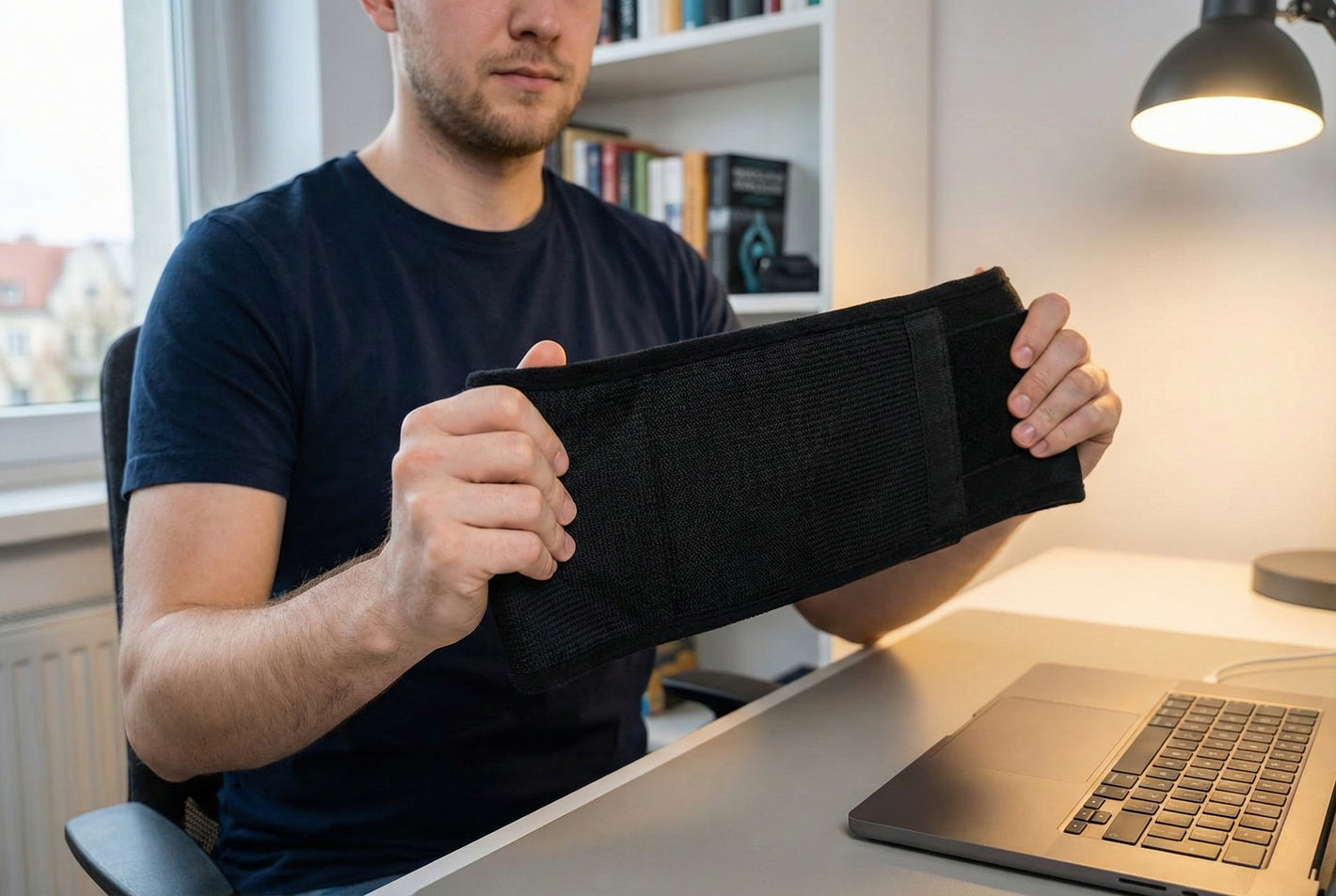 Oczywiście! Opaska ma tylko 3mm grubości i jest całkowicie dyskretna pod koszulą, bluzką czy T-shirtem. Możesz ją nosić w pracy, w domu, na spacerze - nikt nie zauważy. Materiał oddychający zapobiega poceniu.